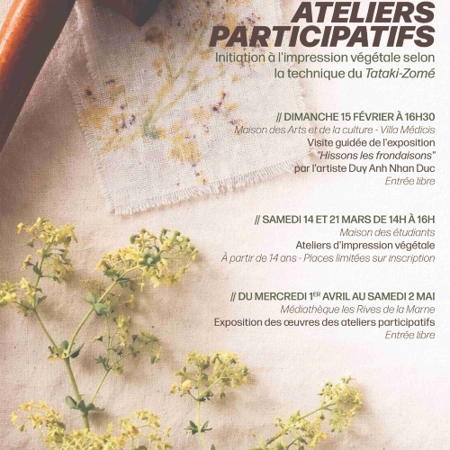 Afficher le planInitiation à l'impression végétale selon la technique du Tataki-Zomé Réalisation de sac en tissus Présence recommandée aux 2 ateliers RDV à la Maion des étudiants Exposition des œuvres réalisées du 01/04 au 02/05